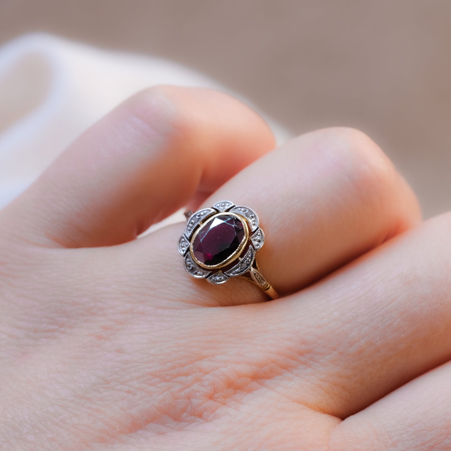 La bague marguerite, apparue dès le XIXᵉ siècle et largement revisitée au fil du XXᵉ, reste un grand classique de la joaillerie. Ici, l’association du grenat — pierre chaude et dense — et des diamants plus lumineux offre un équilibre intéressant, à la fois riche et facile à porter. Les pierres présentent quelques égrisures, témoins discrets d’une patine du temps qui participe au charme et à l’authenticité de la pièce.