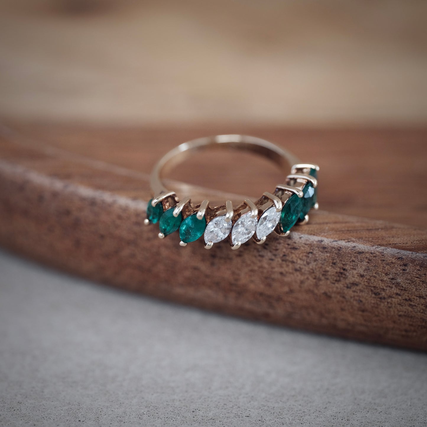 Bague en or jaune 18 carats (750 ‰), sertie de six émeraudes et trois diamants taille navette. L’alternance des pierres crée un motif symétrique et raffiné, où le vert profond des émeraudes contraste avec l’éclat vif des diamants.