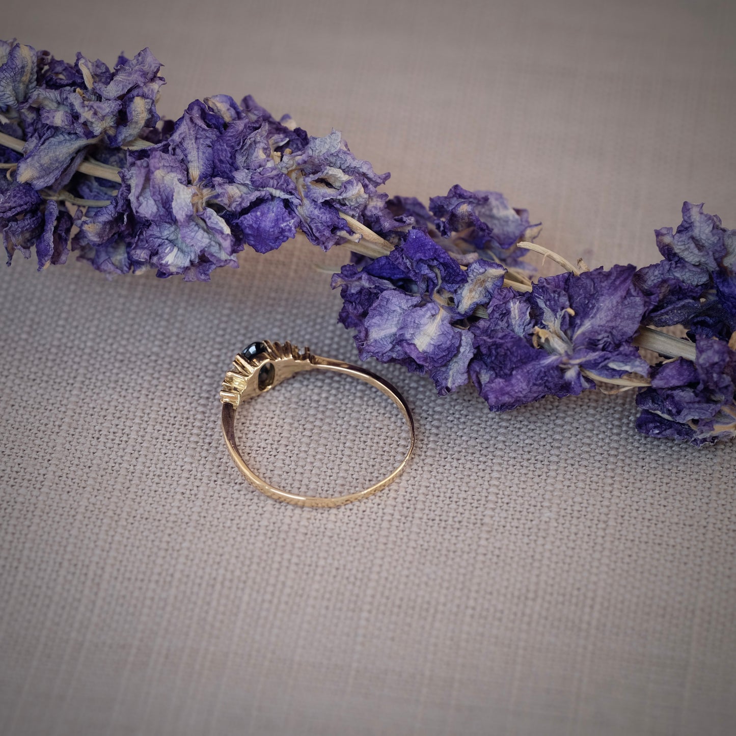 Bague fine en or jaune 18 carats, centrée d’un saphir ovale aux reflets profonds, souligné de chaque côté par de petits diamants brillants. Un modèle délicat et intemporel, idéal à porter seul ou en accumulation.