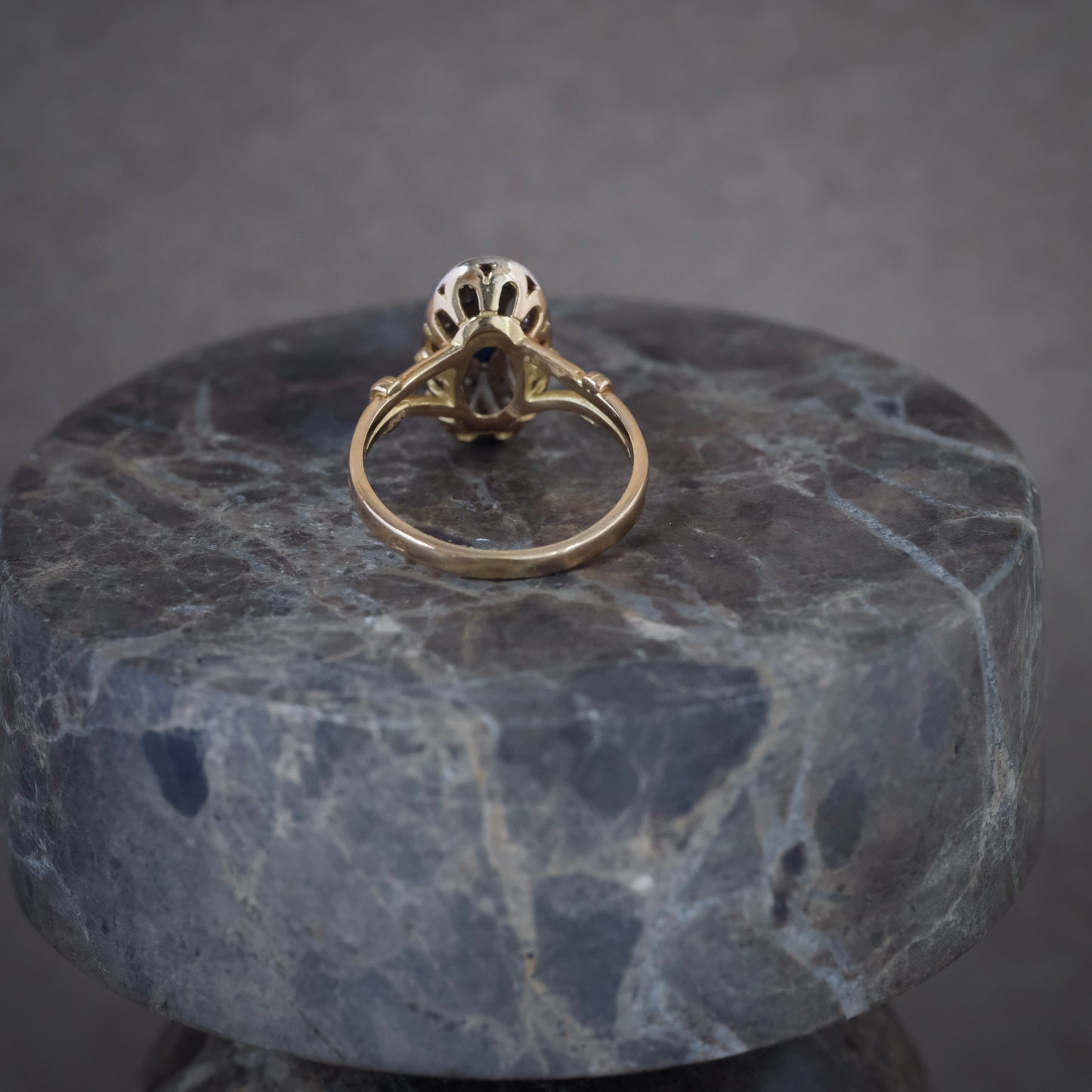 Bague médaillon en or jaune et gris 18k en partie ajouré serti de diamants taille 8/8 et centré d'un saphir navette.