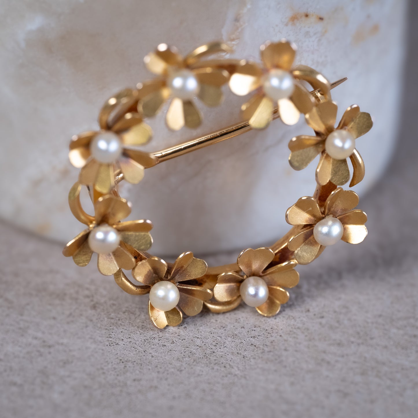 Broche couronne de fleurs en or jaune et perles