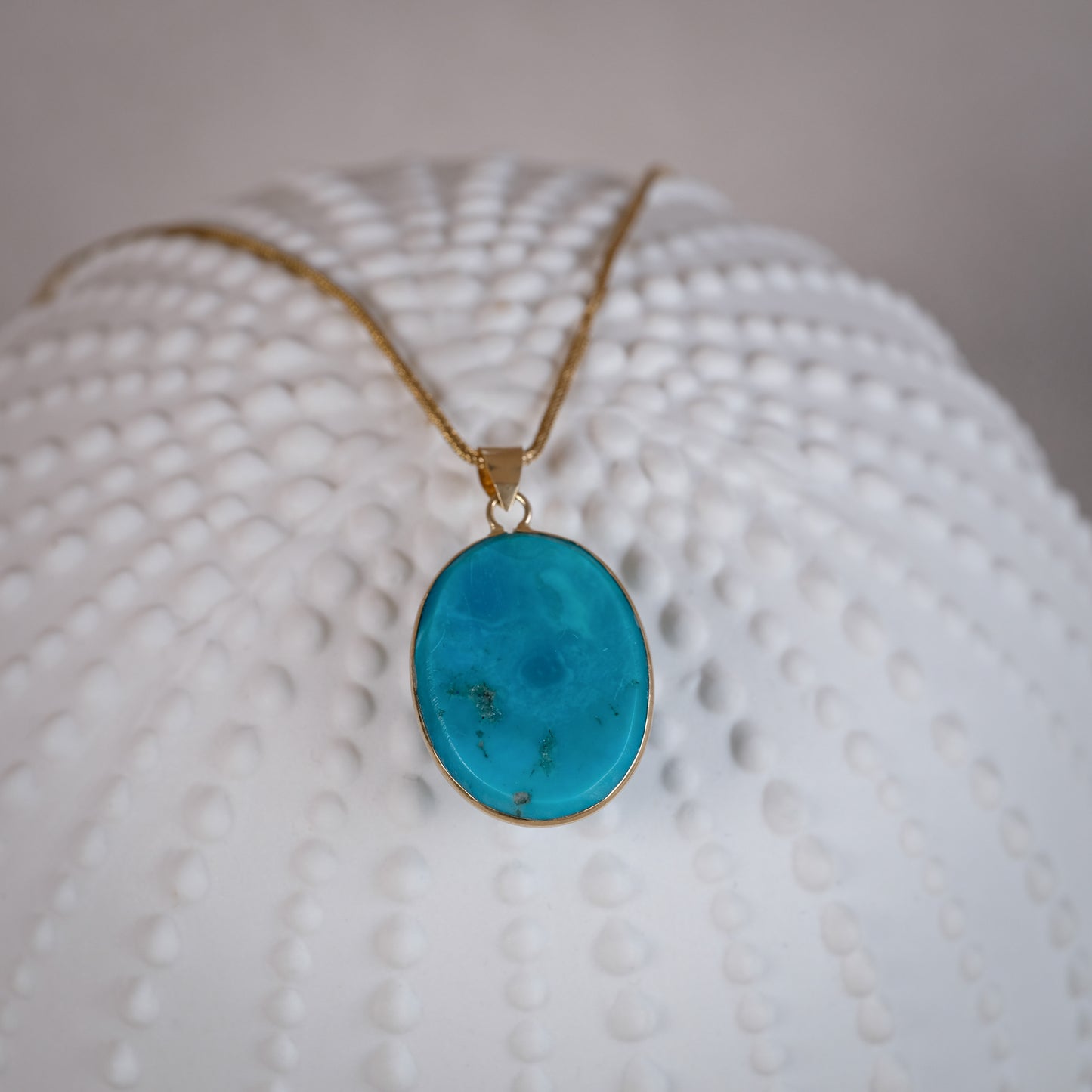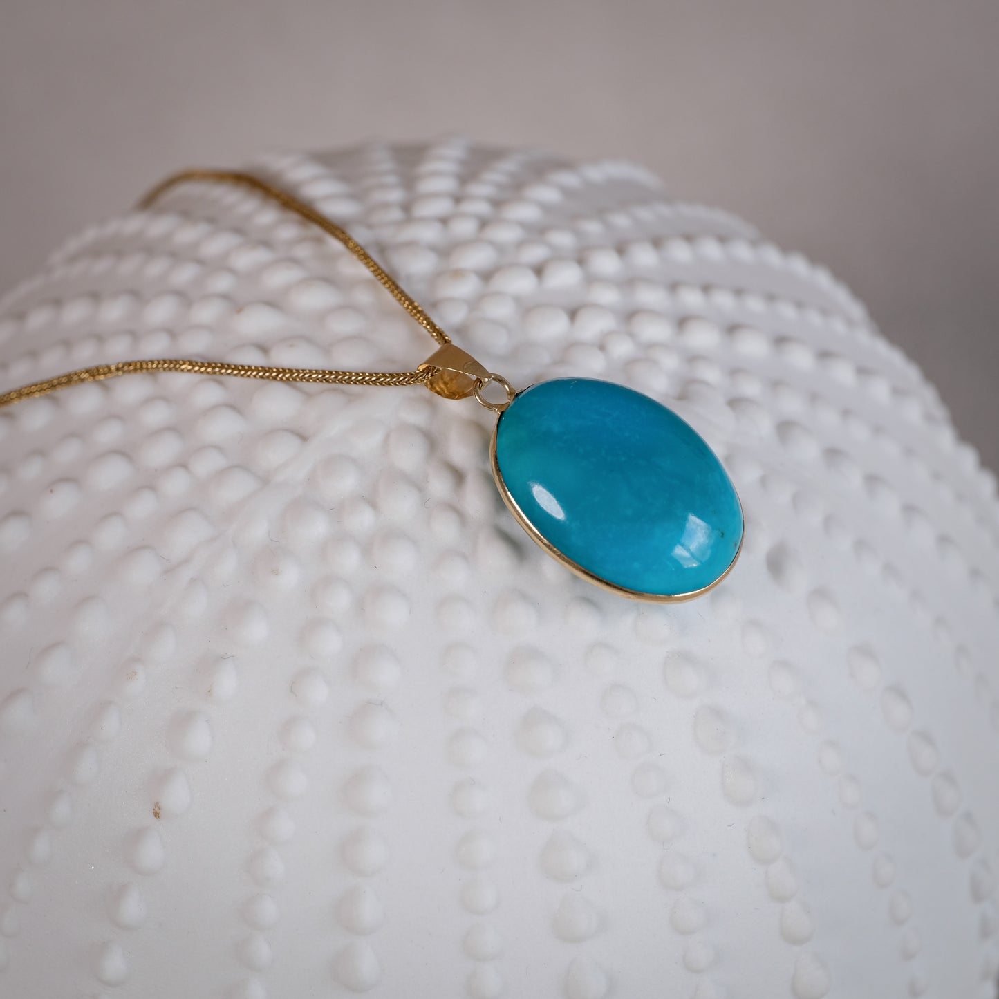 Pendentif en or jaune 18 carats orné d’un cabochon ovale de turquoise à la teinte vive et profonde. La pierre, montée en serti clos, présente un poli miroir qui accentue l’intensité de sa couleur naturelle.