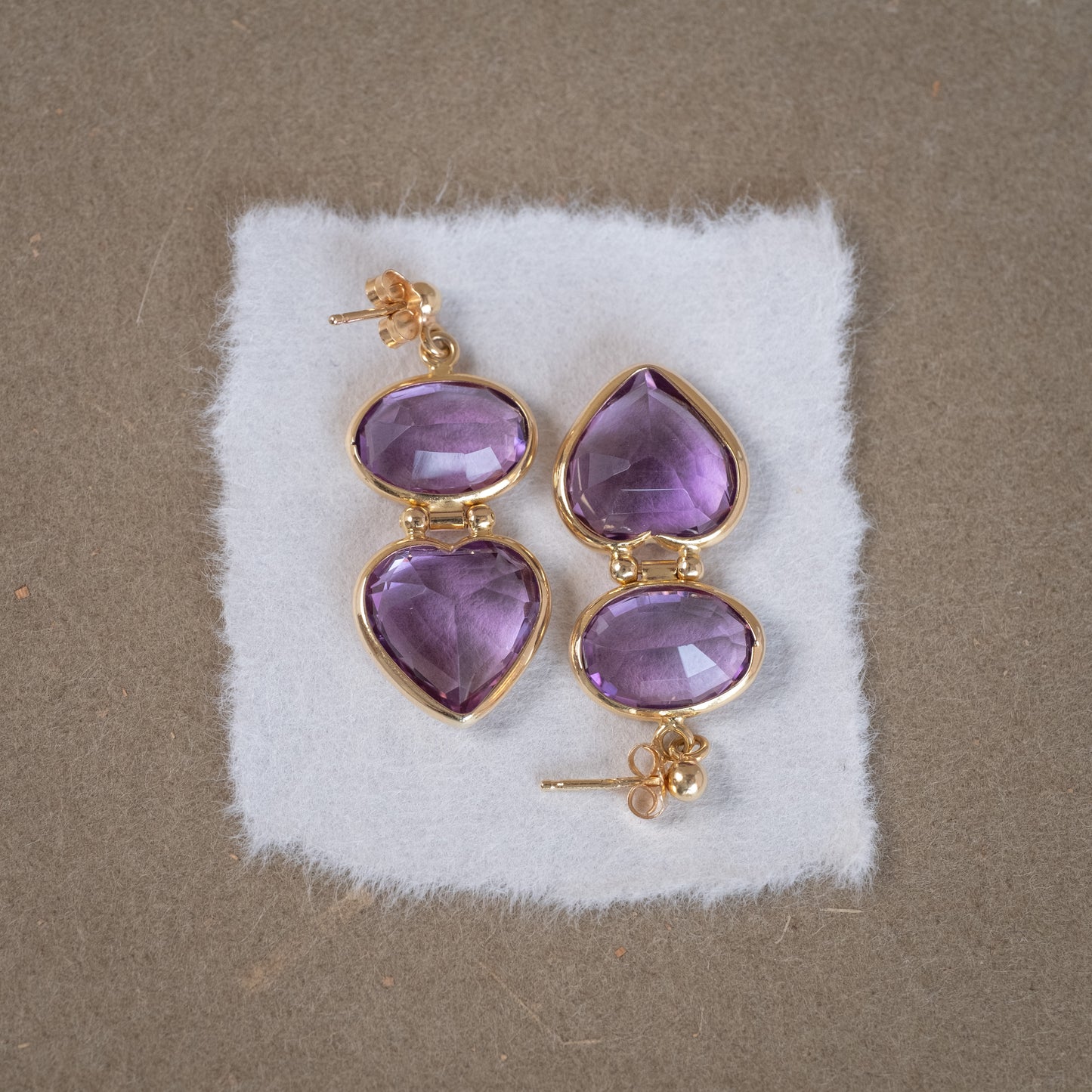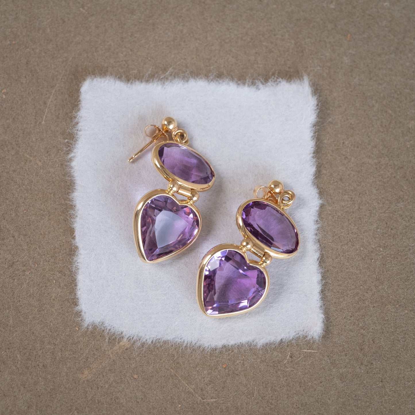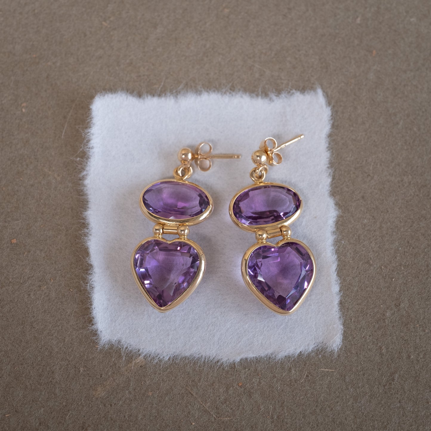 Paire de pendants d'oreille articulés avec améthystes de forme ovale et cœur