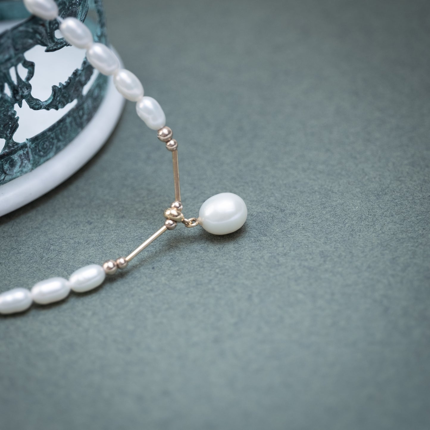 La forme allongée des perles, moins classique que la perle ronde, donne au collier une allure plus fluide, presque organique. Le fermoir et les éléments en or viennent structurer la composition et souligner discrètement la chute centrale.