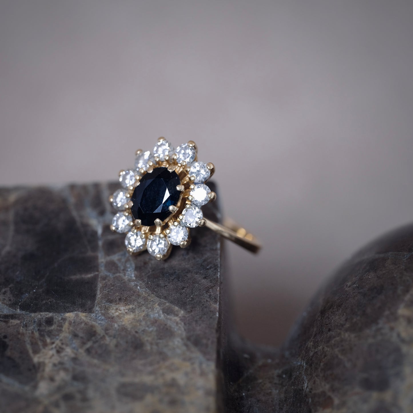 Bague marguerite en or jaune 18 carats, ornée en son centre d’un saphir ovale d’un bleu profond, encadré de douze diamants taille moderne d’environ 0,10 carat chacun. L’un des diamants présente un petit éclat, sans nuire à l’éclat général de la composition.